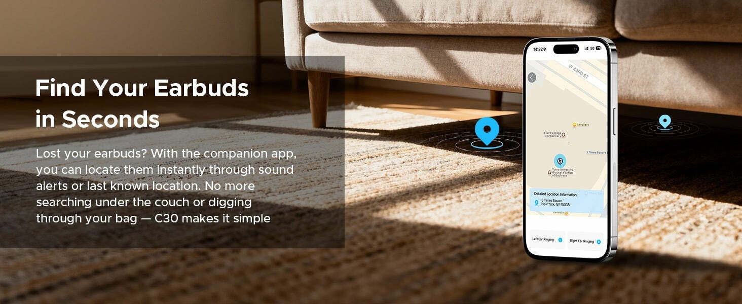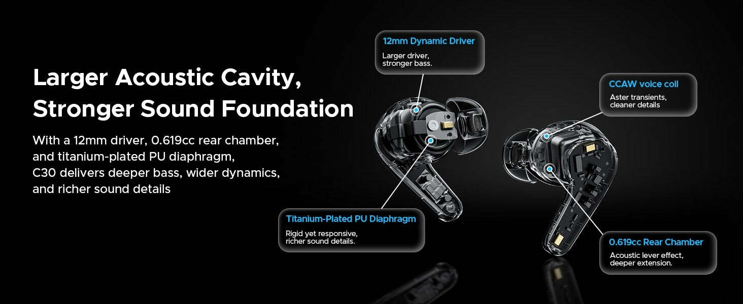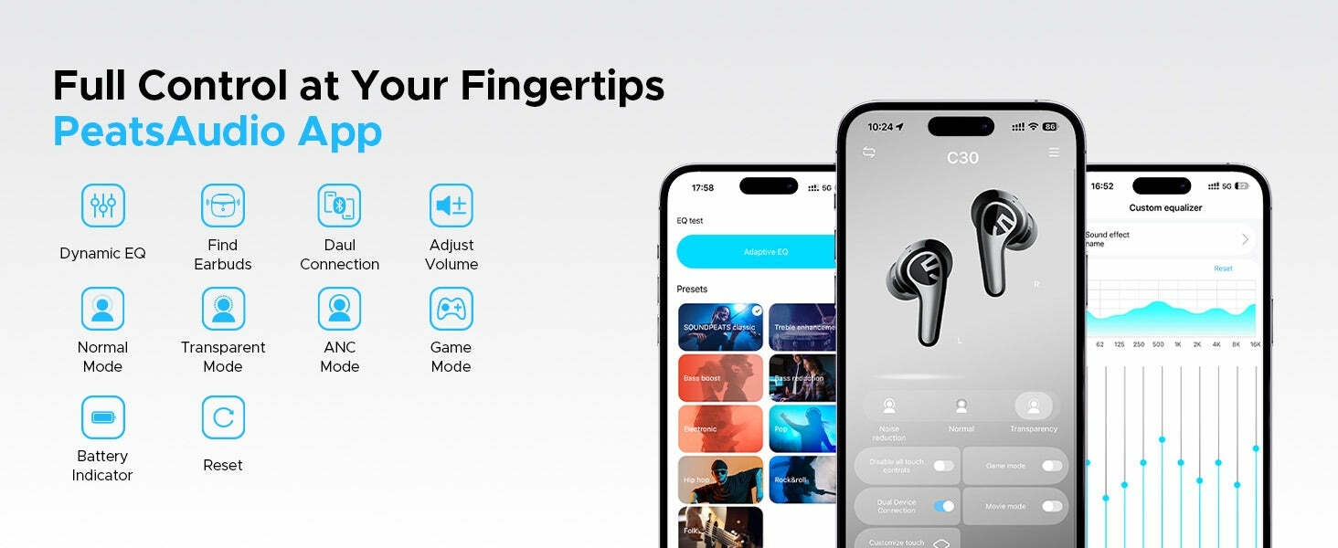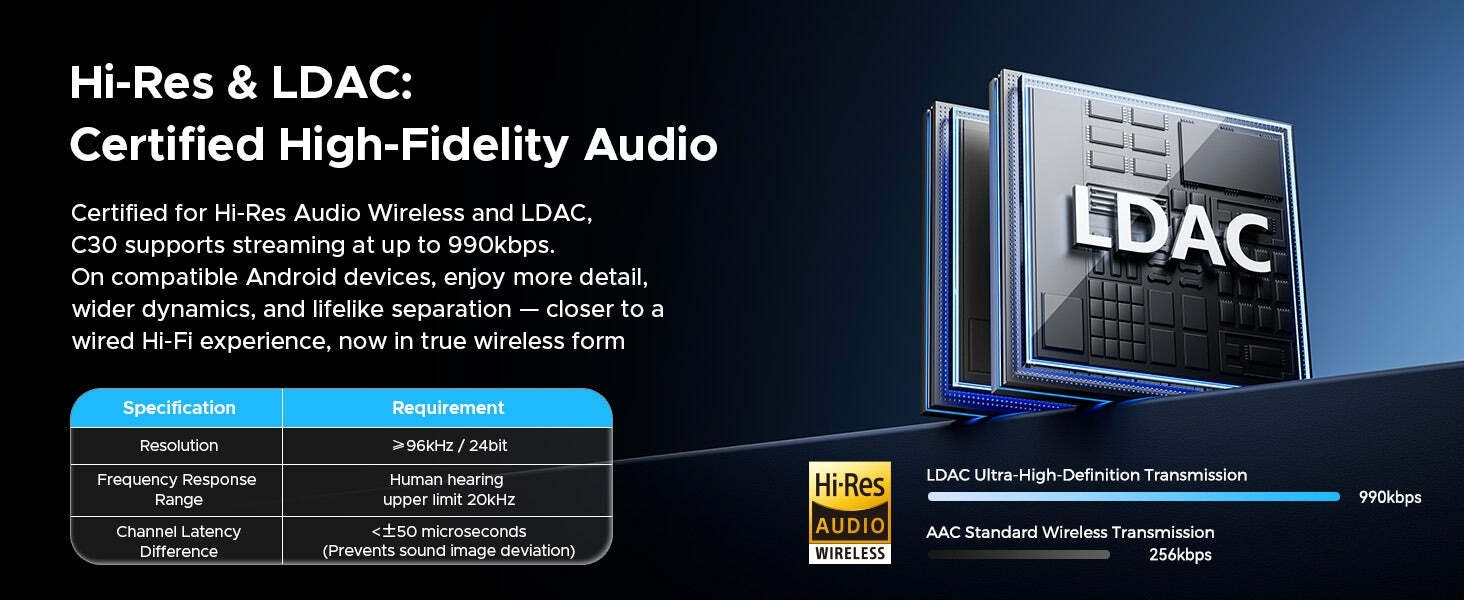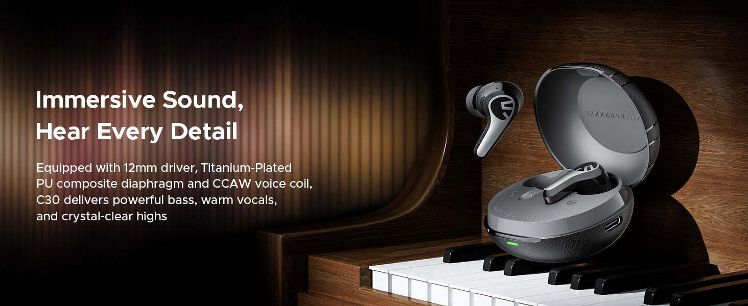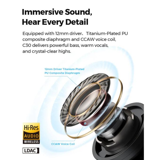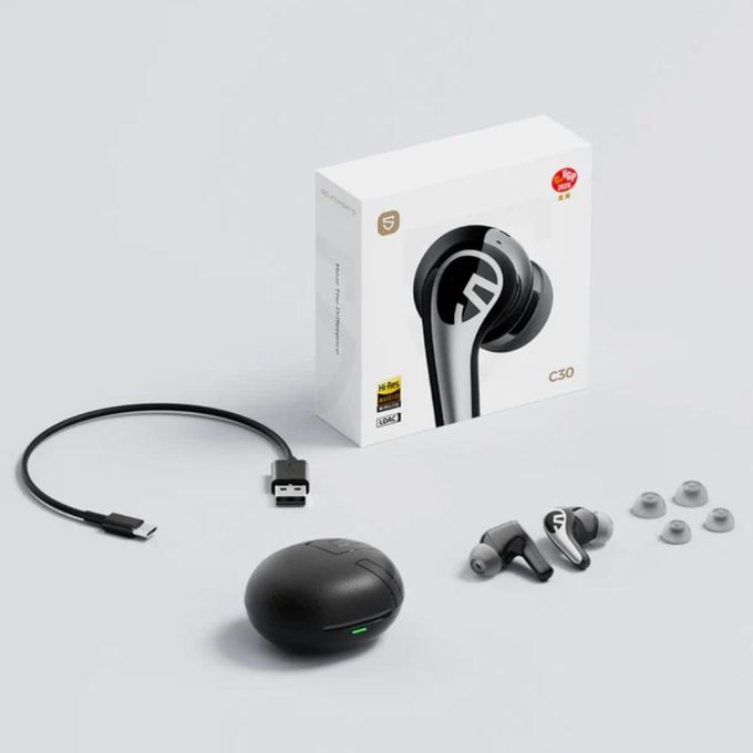 + Free ShippingSoundpeats Écouteurs sans fil C30 – Bluetooth 6 – Drivers 12mm – 6 micros avec ENC – Appels clairs avec basses profondes, Mode jeu, Autonomie 52h, IPX4, Personnaliser l’EQ via l’application – Black